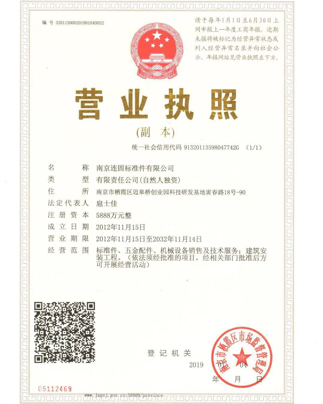 南京連固標準件有限公司,位于南京市棲霞區靖安鎮長江工業園,國家大型企業之一,真正的廠家直銷,價格實惠,現貨供應,庫存量較大,我公司是中國機械通用零部件協會會員,我公司長期與國內外大型企業,重點工程配套。“連固”品牌在國內外市場享有良好的聲譽,為了適應市場經營和自身發展的需要,我公司專業生產.銷售和批發碳鋼 .不銹鋼 .合金鋼 .銅.高強度標準件,年生產能力達8000多噸。碳鋼等級有:4.8級,6.8級,8.8級,10.9級,12.9級。不銹鋼材質有201. 202. 304. 316. 316L.904.904L。主要應用于機械設備,汽車制造. 鐵路.高速鐵路.建筑鋼結構、船舶、貨架,橋梁、道路,風力發電、石油管道等領域。產品質量和信譽得到客戶的一致好評。